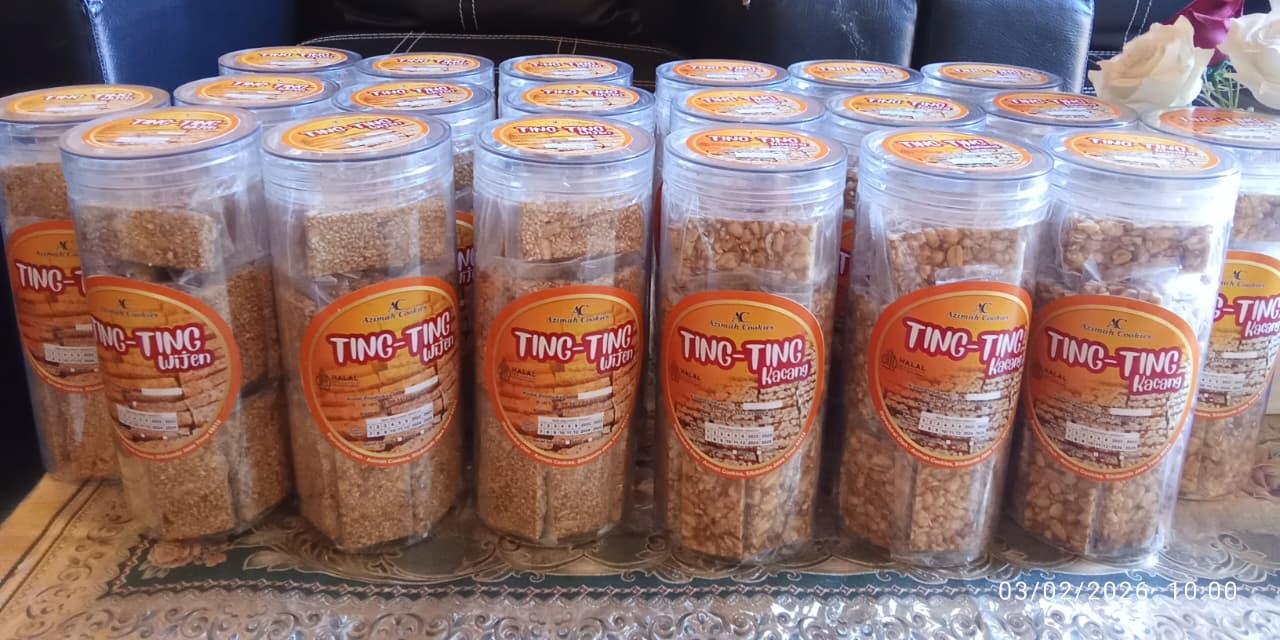 Azimah cookies Ting2 kacang adalah makanan ringan yang berbuat dari kacang pilihan dengan campuran gula dan air.Ting2 wijen adalah makanan ringan yang terbuat dari campuran kacang dan wijen yang di campur dengan air dan gula Harga ± Rp. 55.000